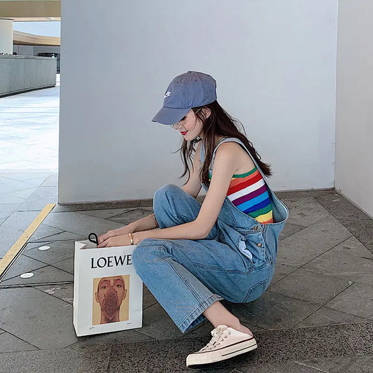 Chic Fall Wide-Leg Denim Overalls & Rainbow Sweater Set